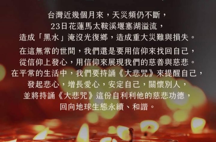 水陸法會剛剛結束,但台灣島尚未得到庇佑。幾個月來的南部災情後,九月底花蓮光復鄉的災情,更揪緊台灣人的心。當我們看到六歲的小妹妹抓緊梁柱兩天後獲救,重回母親的懷
