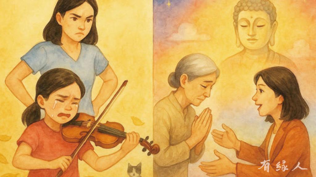 青春期與母親交惡;在學佛之前,與母親也常處在一觸即發的邊緣。小時候,媽媽獻血換錢,給我買了一把小提琴,我至今唱歌走調,學得很是痛苦,成年之後想起那些時光依然不悅。工作後的某個傍晚,心情不佳,推著自行車穿過社區,忽然從某扇窗中傳來嗚嗚咽咽的小提琴聲,似在訴說,那主人怕不是也有了一些心事?琴音流淌間,就瀉給了月色。那一刻,我似乎明白了母親買琴時的用心。