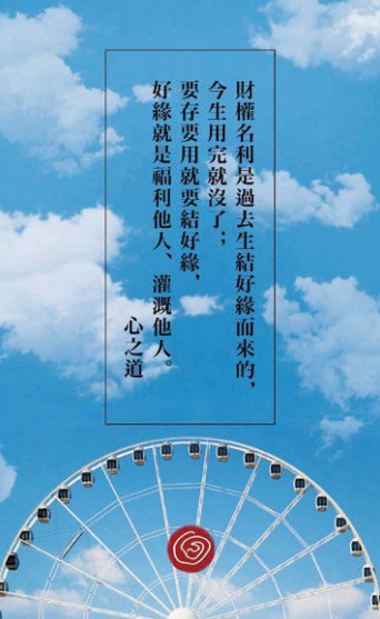 「所以幸福的人生怎麼來?就是為大眾服務,自私就永遠不會快樂。有愛心才會快樂,沒有愛心就找不到生命的喜悅。所以慈悲就是一個快樂的源頭。所謂的慈悲就是憐憫跟付出,幸福就是因為我們肯定自己,然後再去肯定別人。要找到生命的意義,就是找回自己的本來面目,找回了以後,生命意義就有了,我們就會肯定自己,更肯定每一個人都是這個樣子的,所以幸福是找回自己跟服務、奉獻別人。」