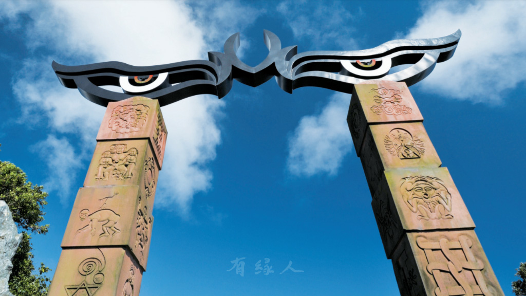 進入靈鷲山上院,老遠會看見一對極為顯目獨特的「大眼睛」,由印度紅砂岩巨石柱拱頂著,心道法師命名「天眼門」,立意是以虛空之眼、空性之眼入法界海,法師說從這裡「入空門、大慈悲行」,站在天眼門口,望向無際的太平洋,入門順山勢走到右脈觀音道場,代表菩薩道行者要有「高高山頂立,深深海底行」的氣魄。