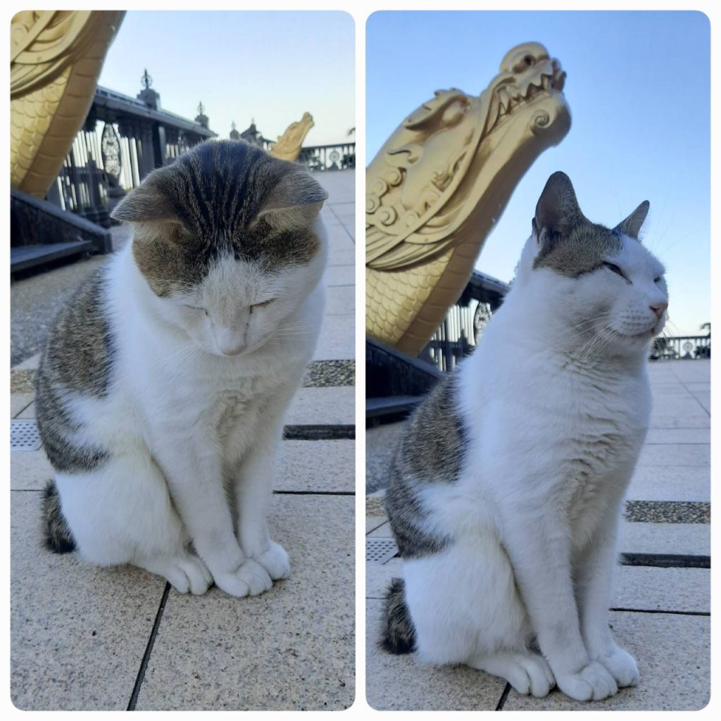輪值晚課法務的這天,又見大白靜靜坐在大殿前,拿出手機拍牠可愛模樣,手機對準牠臉時,牠卻慢慢地低下頭,越來越低,低到我的雙手愈來愈接近地面,相當明顯地,牠…不想讓我拍!
