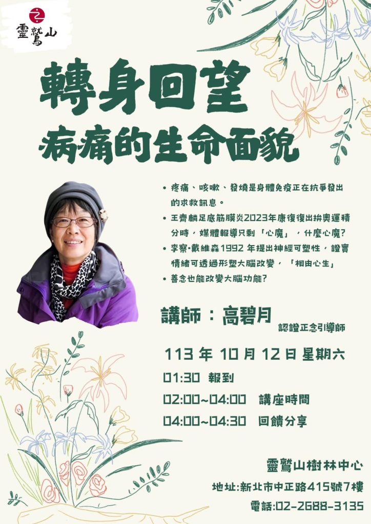 靈鷲山樹林中心,將在十月十二日舉辦「轉身回望—病痛的生命面貌」講座,由認證的正念導引師高碧月老師,帶領大家一起進入精神世界界的奧妙。