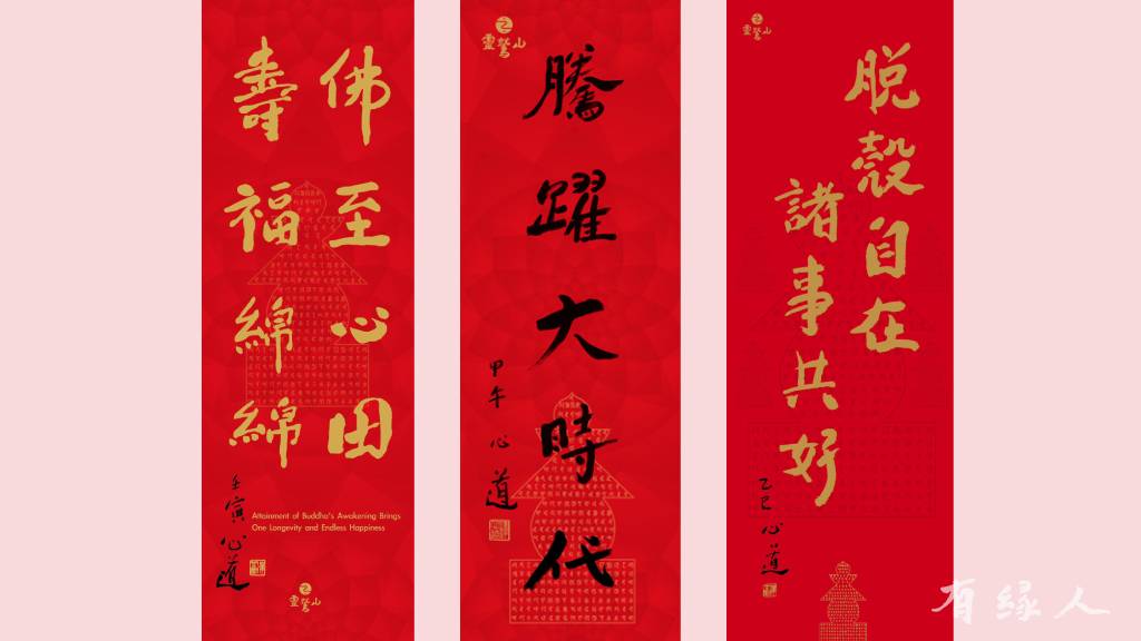 蛇年春聯上巧妙設計了 6 個五輪塔,最明顯的是下方的金色五輪塔,墨寶字底下則襯著1 大 4 小,共 5 個刷淡的五輪塔,代表化解地、水、火、風、空 5 種災難,轉為平安祥和之意。