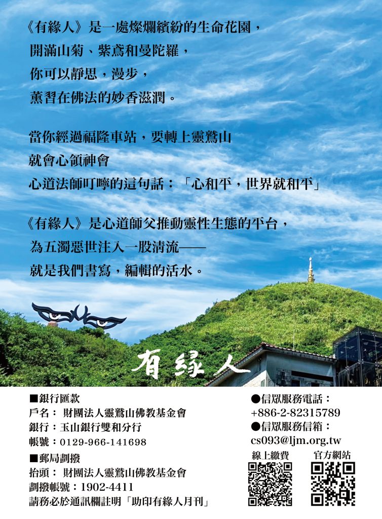 其實,人生沒有自己作主的,每個人的出生,就如海德格所說:「是被投擲到世界。」每個人的開頭就失去選擇權。但是,盡頭呢?能不能像瓊瑤這樣的翩然,或設想就是翩然…(全文請參閱第339期《有緣人月刊》)