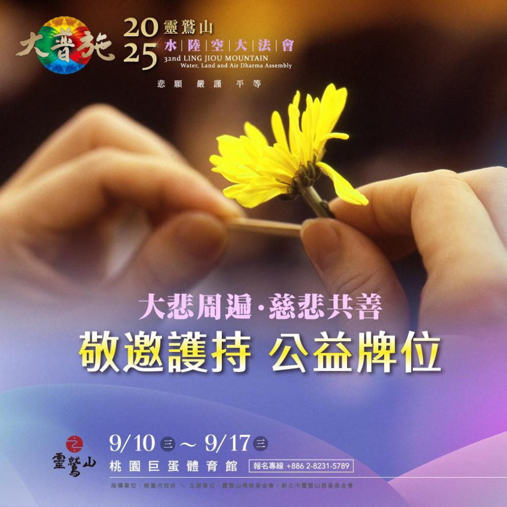 農曆七月是慈悲月,這是一種真實的反思。你可以來靈鷲山的水陸法會護持公益牌位,無緣大慈,同體大悲。靈鷲山水陸法會每年特別設立公益超度牌位和啟建燄口,希望匯集各界善心,轉化災劫。