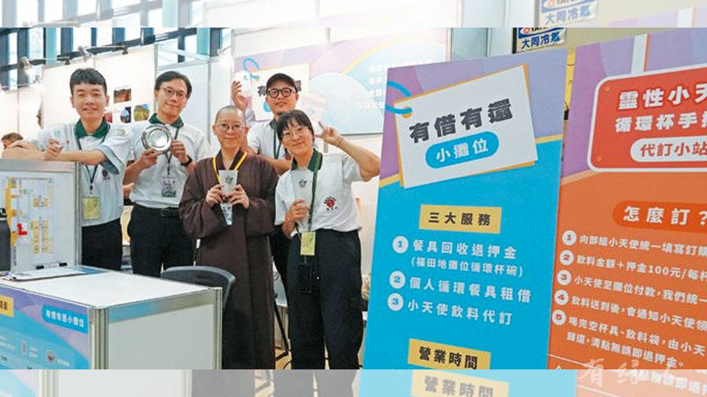 配合今年水陸法會主題「靈性覺醒」,重點在於觀念的願意改變,不要只求自己方便,從簡單的開始,從減少垃圾開始。現場完全配合,沒有一次性餐具,所有攤位用餐區都是循環餐具,可以租,用完也不用洗,有回收站,幫忙專業洗淨及消毒,繳回用過餐具時,就退還你「押金」。