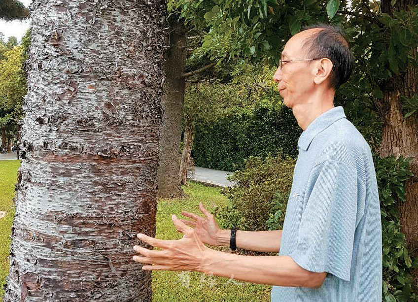 風和日麗的下午,我們在榮星花園,有著松針、龍柏、樟樹成群的綠地上,看著陳煥章中醫老師,閉眼伸出雙掌,對著一棵龍柏進行能量交換。