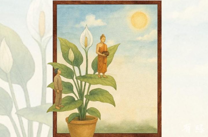 1 min read 在梵諦岡與和平同行 專題 每天,找佛陀散散步 2025 年 12 月 14 日 撰文.曹文坪 插畫.阿怪蜥 晨起梳洗,慣例在佛龕前供水點燈燃香,虔誠頂禮,佛面依舊。換下的佛水,滋潤著後陽台的白鶴芋,葉片欣然翠綠,未見新的花苞。 念頭一閃而過,生理